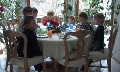 Stefanies Freunde und Stefanie sitzen drinne am Tisch...